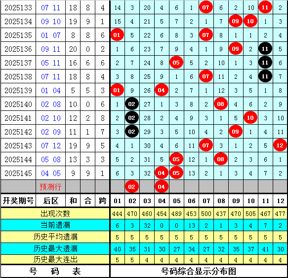 在历史同期奖号中,后区奖号跨度尾数大小比为7:9(定义:跨度1、2、3、10、11为小尾跨度,跨度4、5、6、7、8、9为大尾跨度),其中小尾跨度出现次数较高,本期重点关注小尾跨度再次出现,参考跨度2。