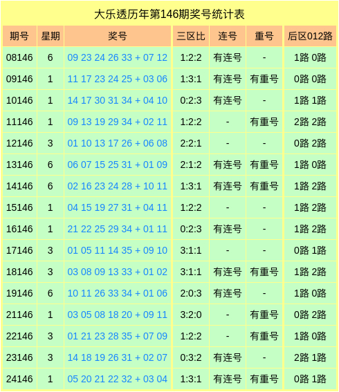 历年同期大乐透奖号数据统计表