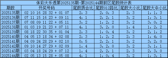 三少第2025145期体彩大乐透前区尾数分析:
