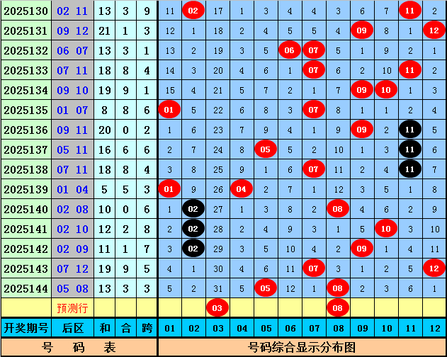 后区分析:在第145期历史同期开奖中,后区奖号全奇出现3次,全偶出现1次,一奇一偶出现12次,今年第145期后区预计出现一奇一偶组合,看好两码03和08。
