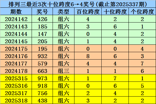 末位跨度分析:前3期末位奖号为6-2-4,最近两期末位奖号跨度为4、2,末位奖号跨度历史上连续两期开出4、2的现象共166次,其最近两次奖号为: