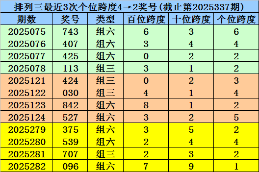 第2025121-第2025123期奖号:424、030、842,其下期奖号为:527,末位号码跨度为3;