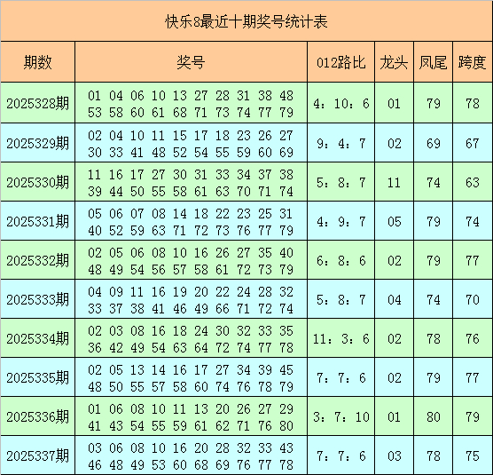 快乐8第2025337期奖号为:03 06 08 10 16 20 28 32 33 43 46 48 49 53 60 68 69 76 77 78,其中奖号012路比为7:7:6,跨度为75。