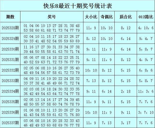 福彩快乐8第2025337期开奖回顾:03 06 08 10 16 20 28 32 33 43 46 48 49 53 60 68 69 76 77 78,其中奖号大小比开出11:9,奇偶比开出7:13,质合比开出3:17,012路比开出7:7:6。