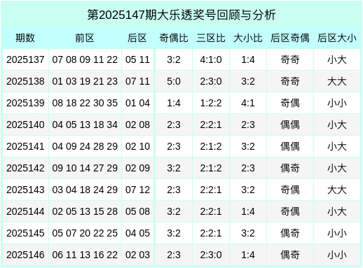 大乐透第25146期开出奖号:06、11、13、16、22 + 02、03。其中前区号码三区比为2:3:0,奇偶比为2:3,大小比为1:4,后区开出偶数+奇数、小数+小数。