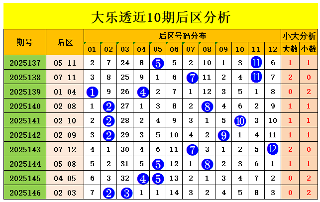 后区近10期大小比为9:11,小码奖号走势稍热,上期开出小小组合,近3期开出,小大、小小、小小、组合,本期后区推荐小大组合;