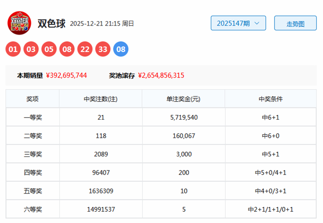 开奖回顾:双色球第2025147期奖号为:01 03 05 08 22 33 + 08,其中红球号码奇偶比为4:2,大小比为2:4,012路比为2:2:2,三区比为4:1:1。