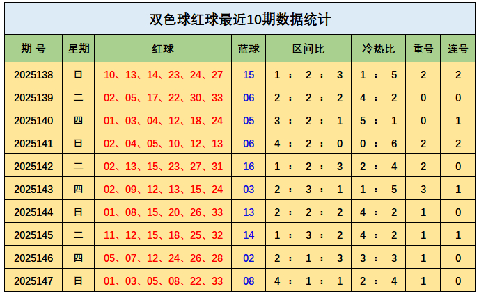 上期回顾:双色球第2025147期开出奖号:红球01、03、05、08、22、33;蓝球08,其中红球三区比为4:1:1,开出1枚重号05,开出0组连号,蓝球开出二区号码08。