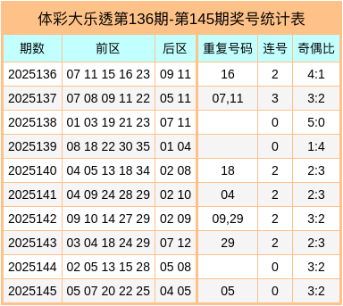 体彩大乐透第25145期奖号为:05、07、20、22、25 + 04、05,前区奇偶比为3:2,连码未出现,重号开出05。