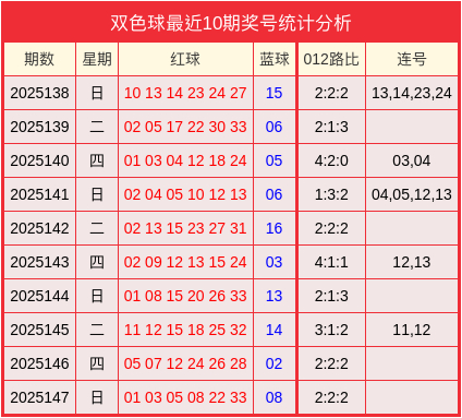 开奖回顾:双色球2025147开奖号码为01、03、05、08、22、33+08。其中012路比为2:2:2、无连号。