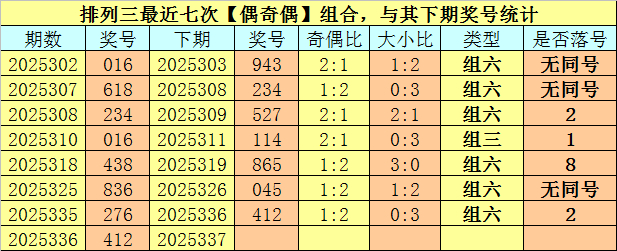 奇偶分析:排列三上期奖号为412,其奇偶类型为【偶奇偶】,最近七次出现奇偶类型偶奇偶的号码分别为:016、618、234、016、438、836、276,其下期奖号分别为:016、618、234、016、438、836、276。其中号码奇偶比为10:11,奇偶奖号开出比例基本平衡,本期看好偶数号码转热,注意奇偶比1:2出现。