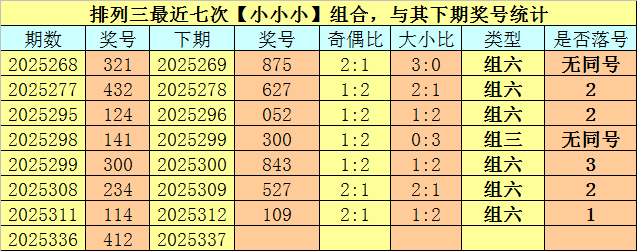 开奖回顾:排列三第2025336期开奖号码为:412。奖号类型为:组六,大小类型为:小小小,奇偶类型为:偶奇偶,包含重号:2。