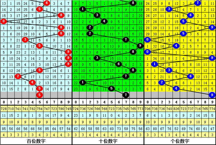 3.在以上9期奖号中,号码012路比分别开出1:1:1、2:1:0、0:2:1、2:1:0、1:1:1、2:0:1、3:0:0、1:0:2、1:1:1,012路出现个数比为13:7:7,本期预计开出012路比1:1:1。