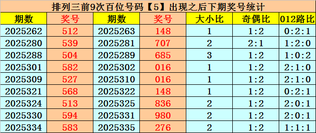 在百位前9次出现号码5之后,下期百位分别开出奖号:1-7-6-0-0-1-8-9-2,其中开出号码个数大小比是4:5,012路比是4:3:2,奇偶比是4:5。