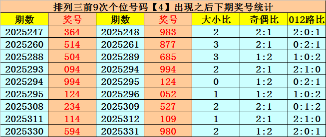 个位号码:上期奖号为小 号、偶数、1路号码:4,历史上个位号码4共开出826期,前一次出现在第2025330期,上期遗漏6期再出。