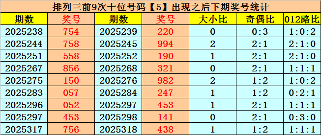 在十位前9次出现号码5后,其下期奖号分别开出:2-9-9-2-8-4-5-4-3,其中奖号个数奇偶比是4:5,大小比是4:5,012路比是3:2:4。