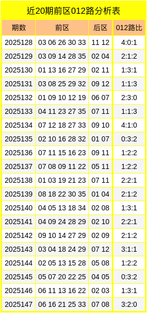 最近20期前区012路比为34:37:29,最近两周前区012路比为10:12:8,上期前区012路比为3:2:0。