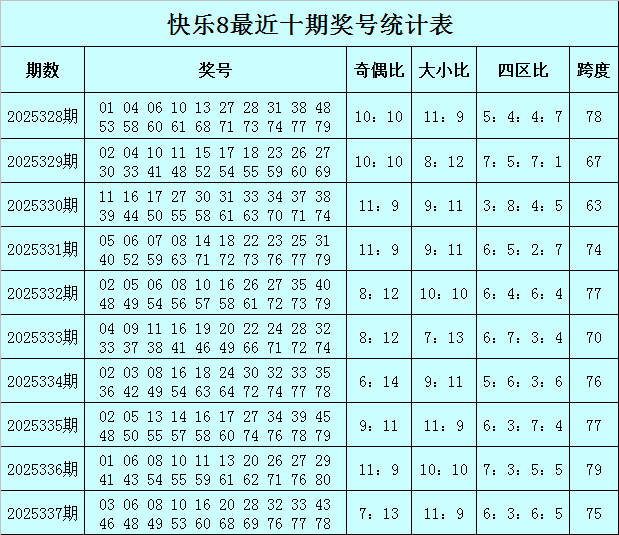 福彩快乐8第2025337期开奖回顾:03 06 08 10 16 20 28 32 33 43 46 48 49 53 60 68 69 76 77 78,其中奖号012路比为7:7:6,奖号尾数012路比为13:1:6。