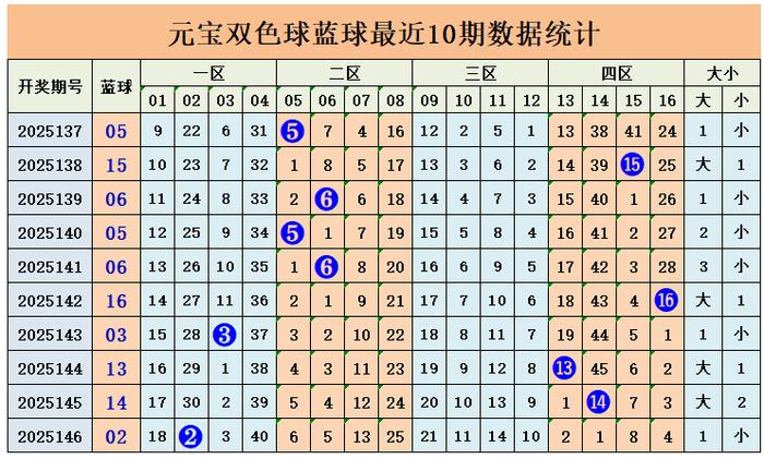 上期回顾:双色球第2025146期开出奖号:红球05、07、12、24、26、28;蓝球02,其中红球三区比为2:1:3,奇偶比2:4,蓝球开出小偶数号码02。