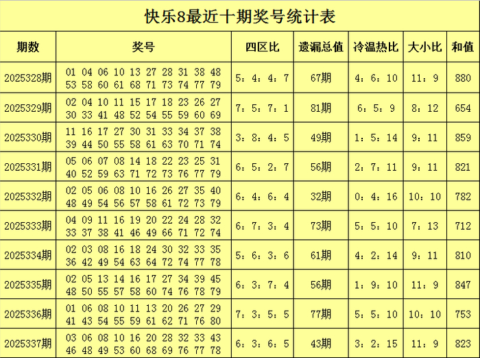福彩快乐8第2025337期开奖回顾:03 06 08 10 16 20 28 32 33 43 46 48 49 53 60 68 69 76 77 78,其中奖号四区比为6:3:6:5,遗漏总值为43,大小比为11:9,012路比为7:7:6,和值为823。