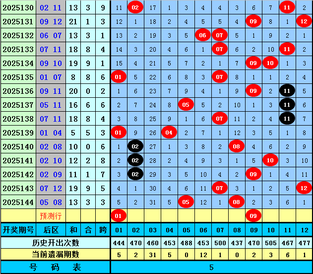 后区五码推荐:01、05、08、09、12