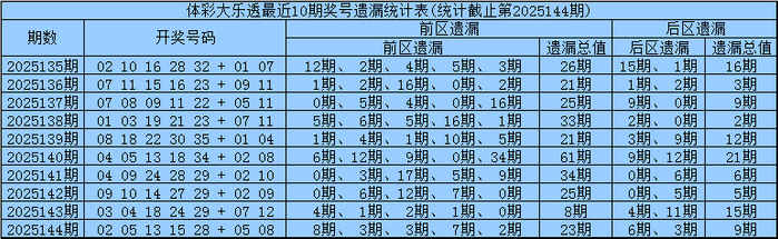 凡哥体彩大乐透第2025145期前区五区遗漏分析:(定义:遗漏0-3期号码为热码,遗漏4-9期号码为温码,遗漏10期及10期以上号码为冷码)