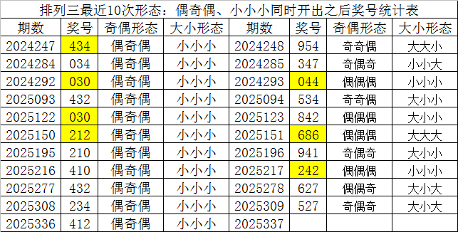 排列三最近10次同时开出奇偶形态:偶奇偶和大小形态:小小小时其奖号分别为:434-034-030-432-030-212-210-410-432-234-412,下期分别开出号码为:954-347-044-534-842-686-941-242-627-527,详细统计见下表:
