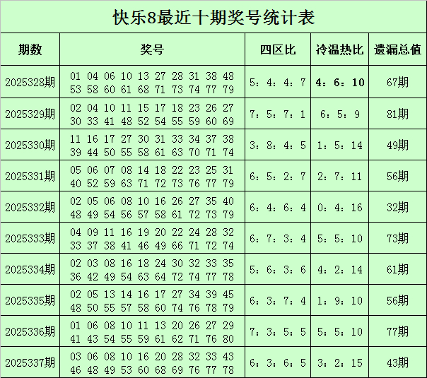 福彩快乐8第2025337期开奖回顾:03 06 08 10 16 20 28 32 33 43 46 48 49 53 60 68 69 76 77 78,其中奖号四区比为6:3:6:5,冷温热码比为3:2:15,遗漏总值为43。