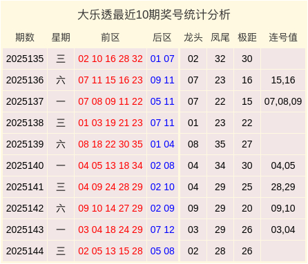 后区分析:近十期后区奖号的大小比为12:8,上一期开出小大数05、08,本期关注后区开出大大数07、10。
