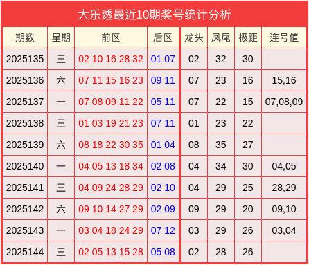 开奖回顾:大乐透第2025144奖号:02、05、13、15、28+05、08。其中奇偶比为3:2,大小比为1:4,和值为63。