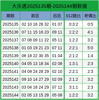 大乐透第25144期开出奖号:前区02、05、13、15、28;后区05、08。其中前区012路比为1:2:2,奇偶比3:2,后区四分区开出2区+3区号码。