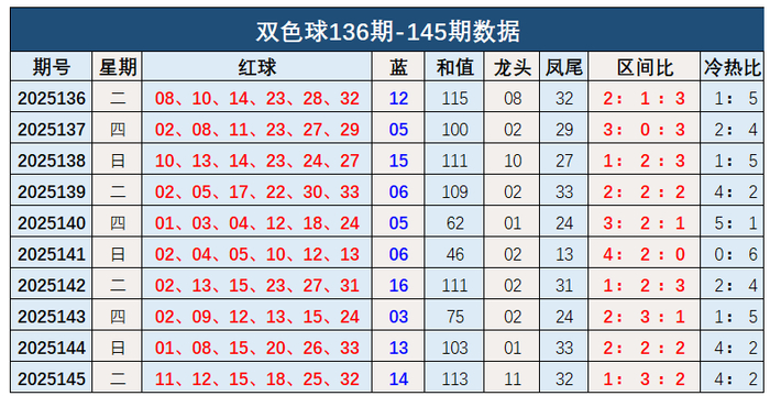 双色球第2025145开奖奖号:红球11、12、15、18、25、32,蓝球14。和值113,龙头11,凤尾32,区间比1:3:2,冷热比4:2。蓝球开出大数号码14。