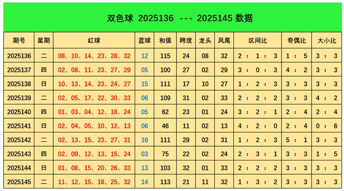 上期回顾:双色球第2025145期开出奖号:红球11、12、15、18、25、32;蓝球14,其中红球三区比为1:3:2,奇偶比3:3,大小比为3:3,蓝球开出2路号码14。
