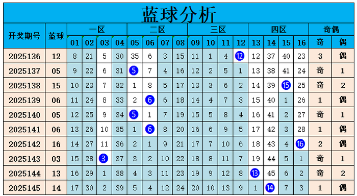 蓝球分析:上期蓝球开出偶数号码14,近10期奇偶比为5:5,奇数、偶数走势相同,近十期蓝球奇偶走势为:偶-奇-奇-偶-奇-偶-偶-奇-奇-偶-,本期蓝球关注偶数开出;本期蓝球参考:08